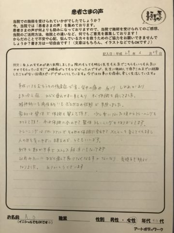 腰痛事故によるむちうちの後遺症で首・背中の痛み、肩こり、しびれがあり、また冷え性、ひどく疲れやすい事もあり、すぐ体調を崩していました。精神的にも肉体的にもボロボロの状態で来院しました。最初は整体で体調を整えて頂き、少し楽になったころからトレーニ...